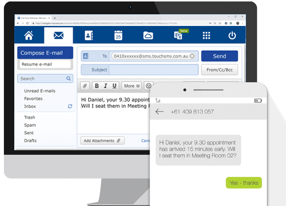 At touchSMS, we realise that most people spend the majority of their day sending and receiving emails. It just made sense to allow our customers to manage SMS the same way – from the same place. Our Email to SMS gateway allows you to send emails and have the content received as SMS. Simply register your sending email address to your touchSMS account and you’re ready to send!