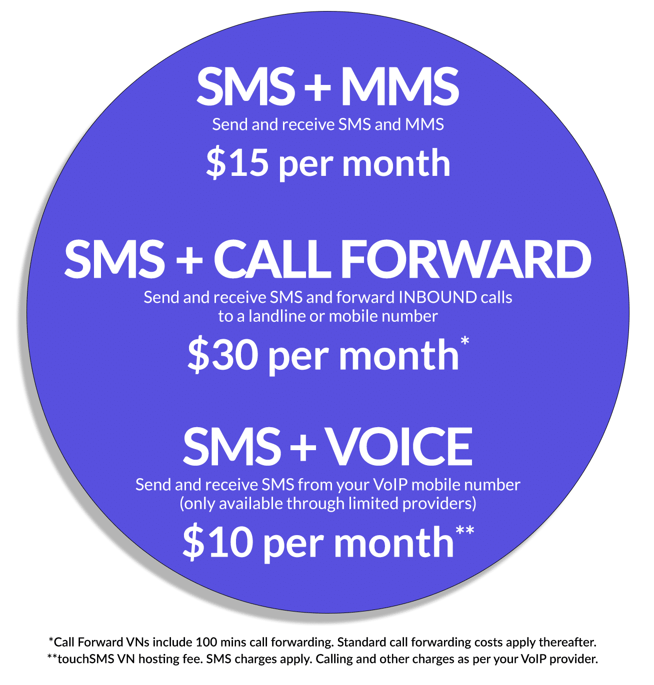 *No outbound calling or MMS functionality on Call Forward Virtual Numbers. *Prices exclude gst